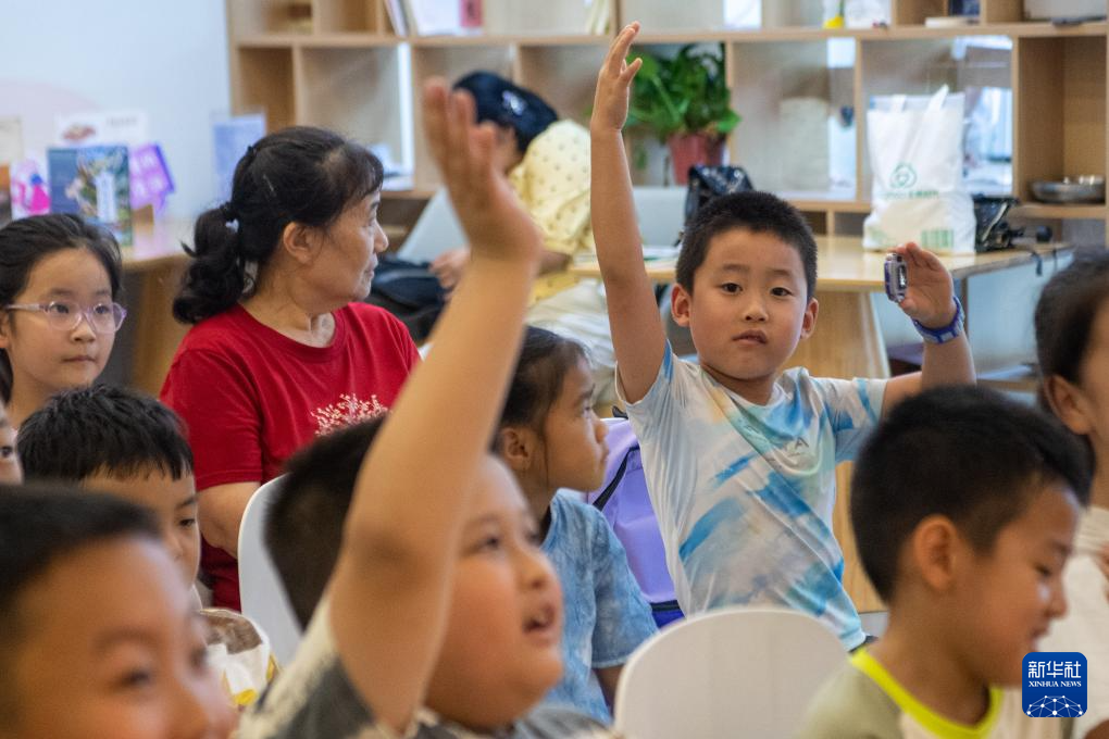 7月31日,在重庆市两江新区大竹林街道竹林社区学院举办的文化艺术游园会活动上,小朋友举手与老师互动。