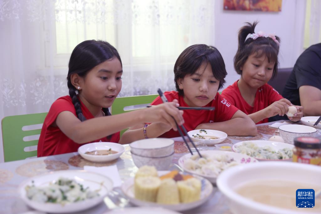 7月25日,位于新疆和田地区策勒县亚博依村国网新疆电力有限公司驻策勒县工作队的食堂里,帕提曼罕·排日海提(左)和小伙伴们在吃叔叔阿姨们一大早包好的送行饺子。