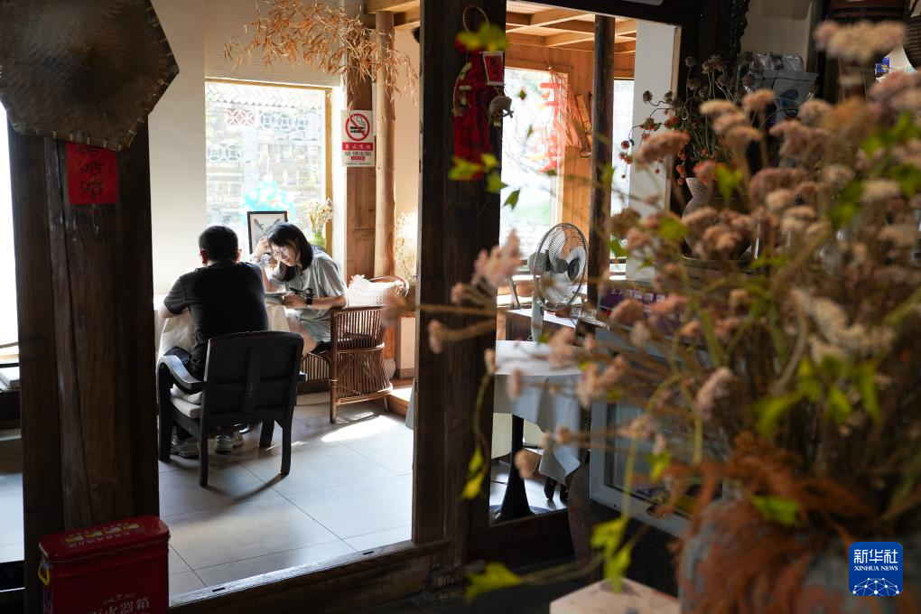 游客正在楠坪村的咖啡馆休息(8月1日摄)。