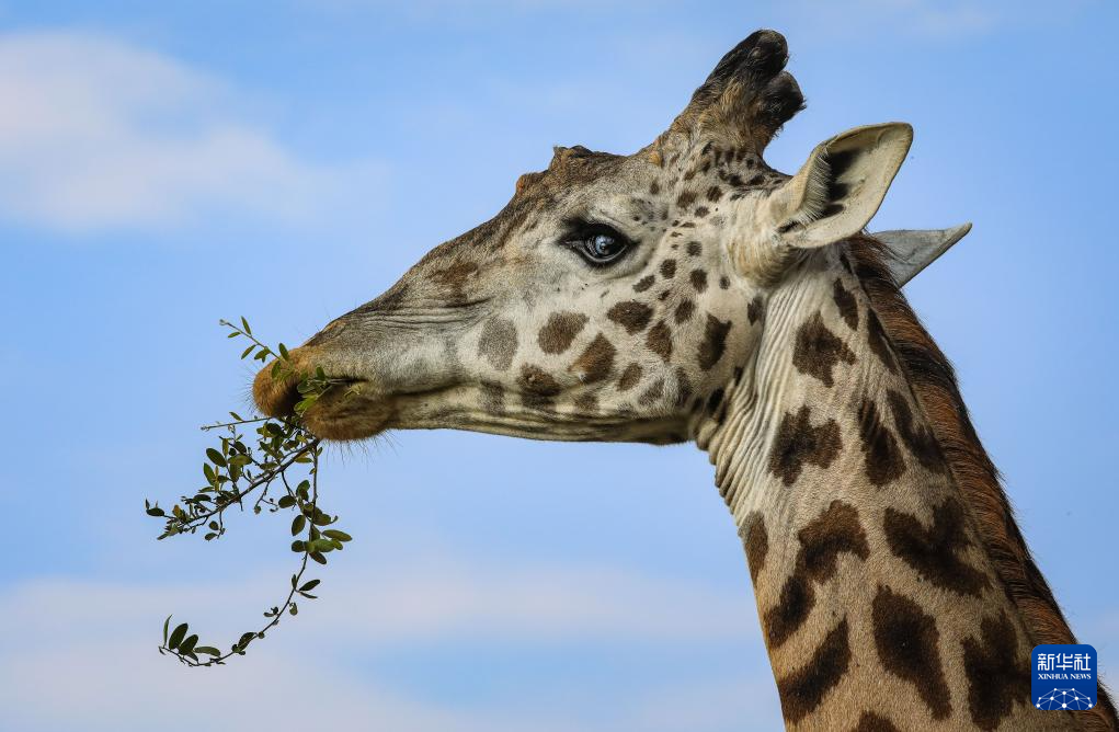 7月30日,在肯尼亚马赛马拉国家保护区,一只长颈鹿在进食。