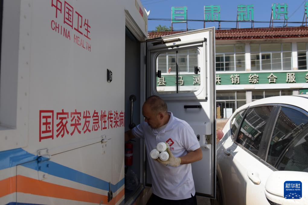 8月11日,在榆中县马坡乡马莲滩村,卫生防疫工作人员准备消杀药品。