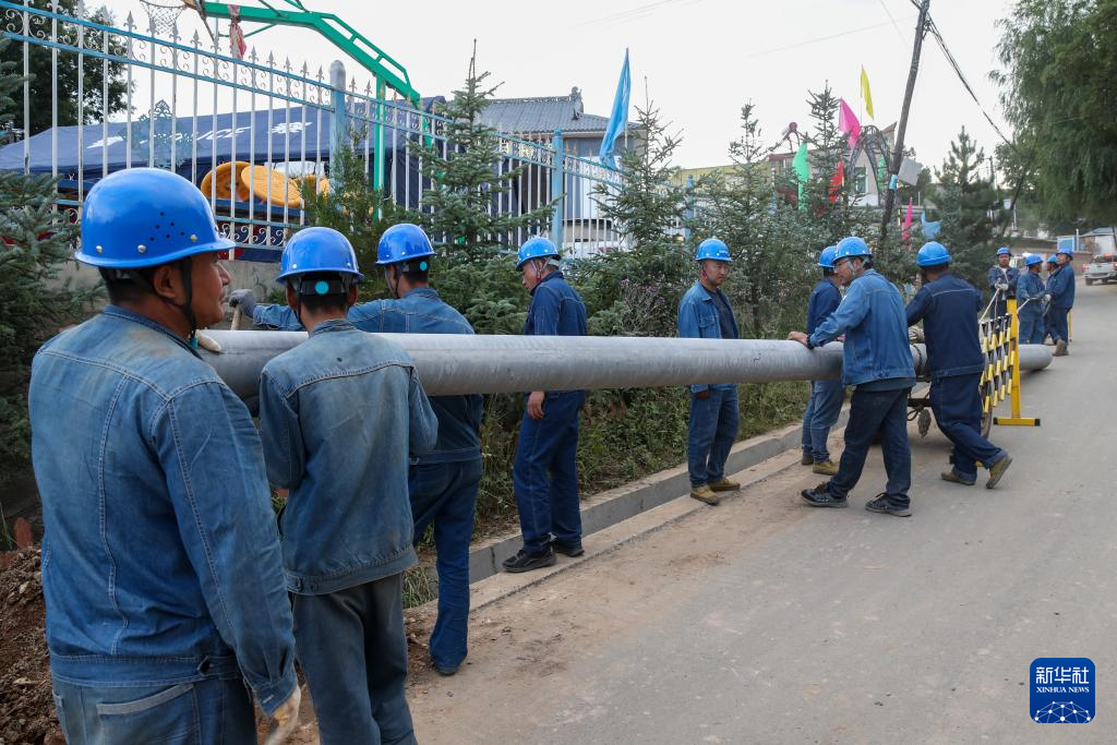 8月11日,在榆中县马坡乡上庄村,电力人员进行立杆架线作业。