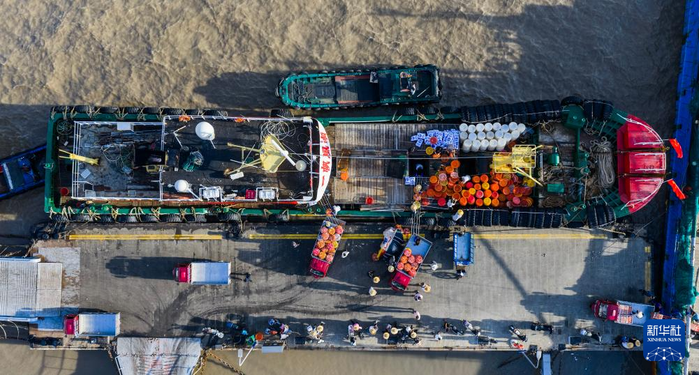 8月12日,开渔归来的渔运船靠泊在舟山沈家门舟山国际水产城码头,整筐的梭子蟹被运送上岸装车(无人机照片)。