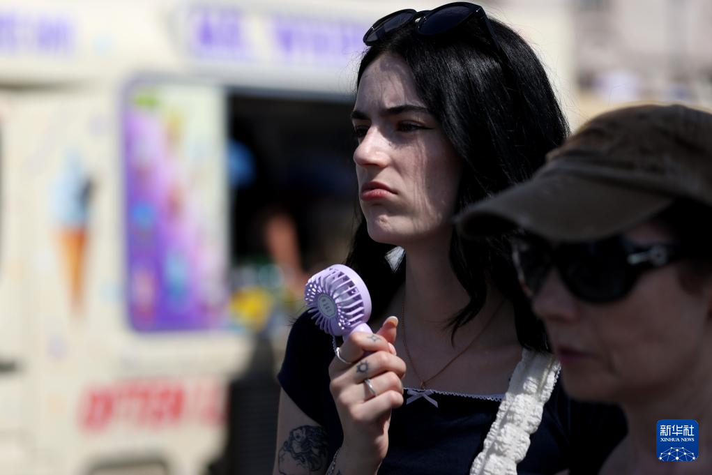 8月12日,在英国伦敦,一名女子手持小风扇纳凉。