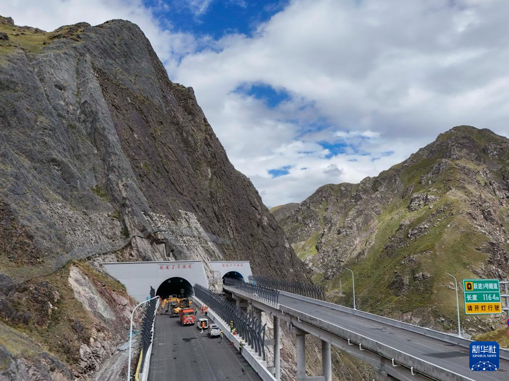 工人在新疆乌尉高速公路跃进3号隧道南端施工(8月19日摄,无人机照片)。