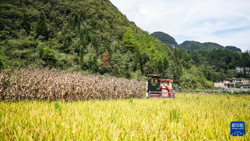 工作人员驾驶农用机械在长顺县长寨街道中塘村收割水稻(9月17日摄)。
