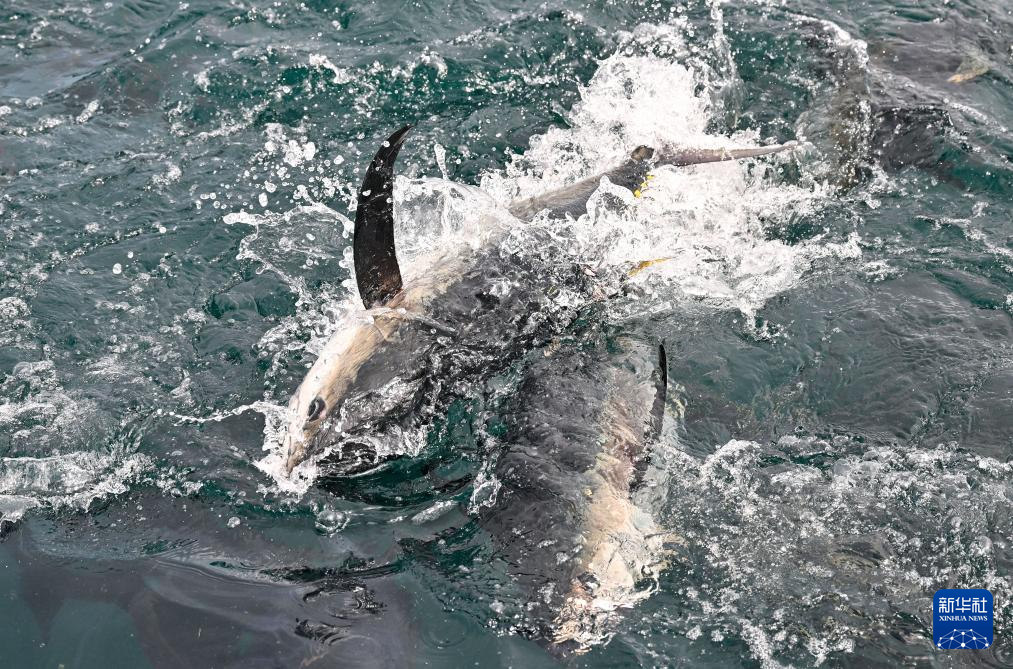 9月17日,陵水黄鳍金枪鱼海上养殖示范基地里的金枪鱼在抢食。