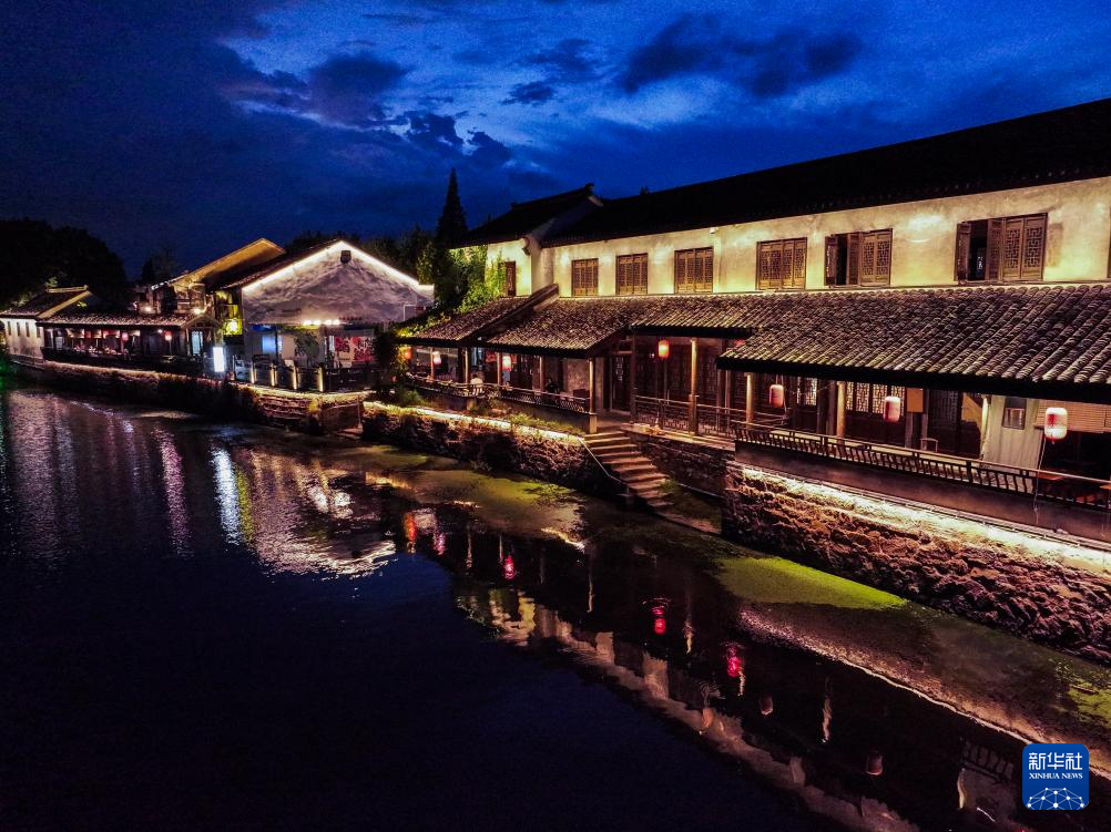 这是9月19日拍摄的夜色中的沈荡镇老街(无人机照片)。