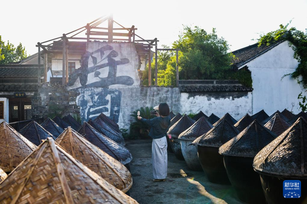 9月19日,游客在沈荡镇的中华老字号企业海盐沈荡酿造有限公司的传统晒场拍照留影。