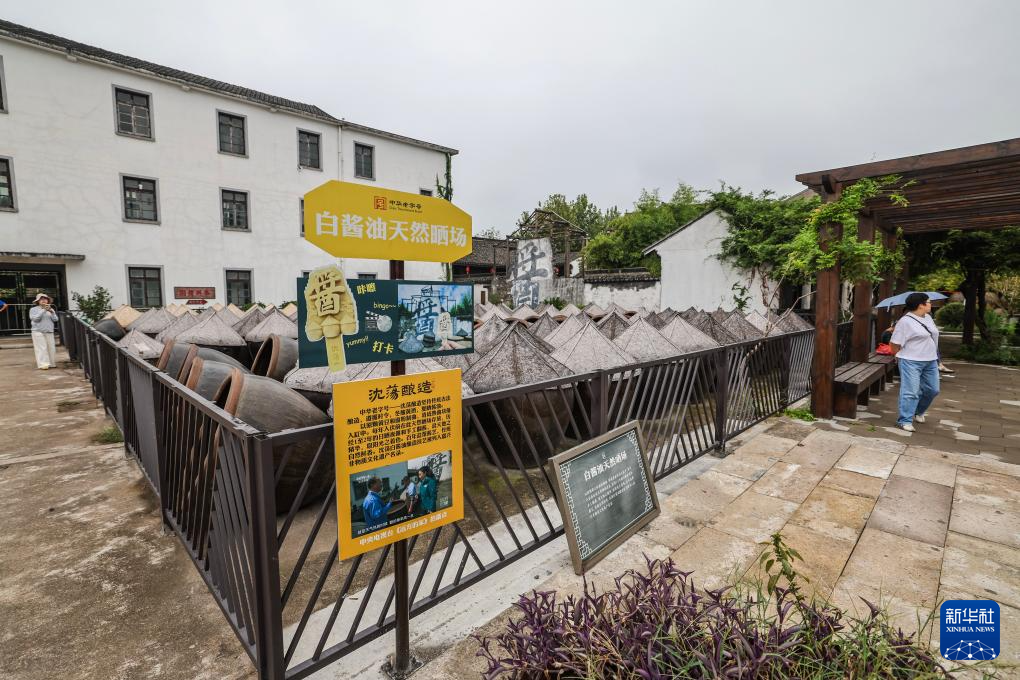 9月20日,游客在游览沈荡镇的中华老字号企业海盐沈荡酿造有限公司。中华老字号企业海盐沈荡酿造有限公司位于浙江省嘉兴市海盐县沈荡古镇,其前身为始创于清光绪年间的泰兴酱园,至今已有100多年历史。近年来,沈荡酿造在坚守传统、古法自然酿造的基础上,结合沈荡古镇旅游开发,配合打造“千年古镇、百年老厂”文旅综合项目,让更多人体验非遗和传统文化的魅力。