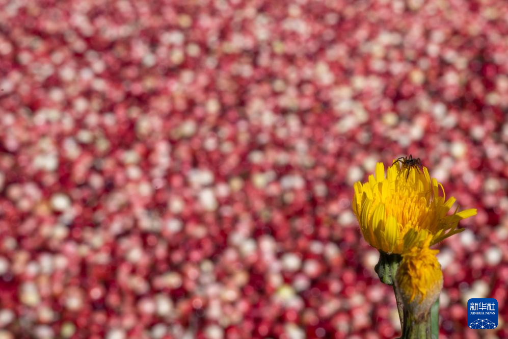 这是9月21日以一朵花为前景拍摄的抚远市蔓越莓种植基地内的蔓越莓。