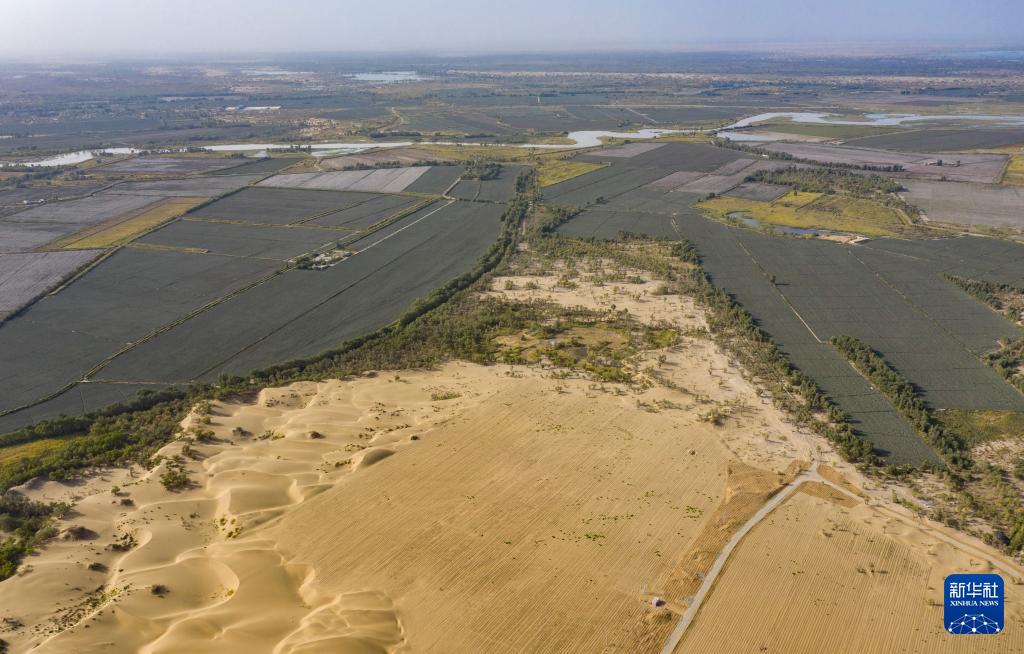 在新疆尉犁县境内的塔里木河南岸防沙治沙区拍摄的罗布麻种植区(右下)、治理之前自然形成的沙丘(左下)、塔里木河及周围绿洲(上)(无人机照片,9月20日摄)。
