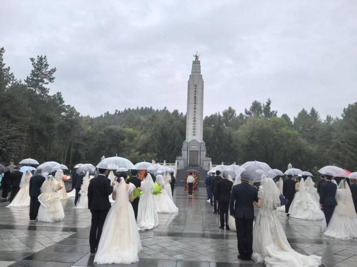 中新网黑龙江新闻9月28日电(记者姜辉)“我们向长眠于此的英雄们郑重宣誓:您的遗志,我们继承;您的山河,我们守护;您的梦想,我们实现!”日前,秋韵浓浓的牡丹江下着细雨,牡丹江市抗日战争暨爱国自卫战争殉难烈士纪念碑下,26对新婚夫妇以鲜花为信、以敬仰为凭,告慰先烈忠魂,传承红色精神,表达对英烈的深切缅怀与崇高敬意。