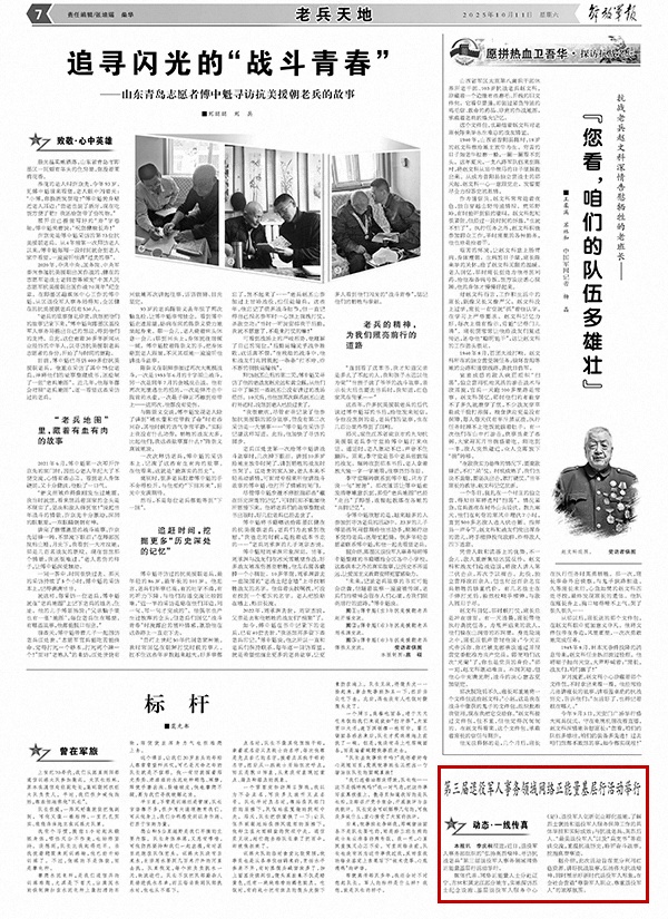 解放军报讯 李庆桐报道:近日,退役军人事务部组织的“弘扬英烈精神、寻访抗战老兵”第三届退役军人事务领域网络正能量基层行活动举行。