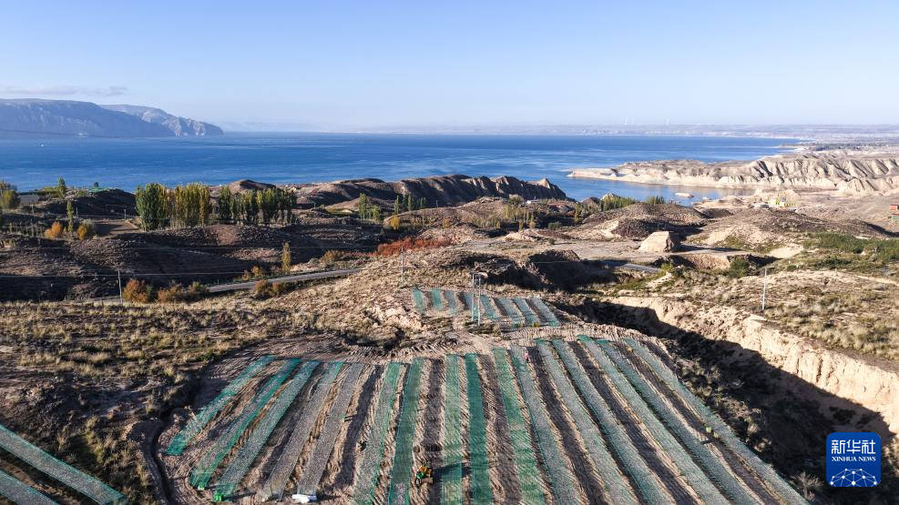 10月18日拍摄于青海省海南藏族自治州共和县龙羊新村龙羊峡海湖渔业捕捞合作社的小银鱼晾晒网(无人机照片)。