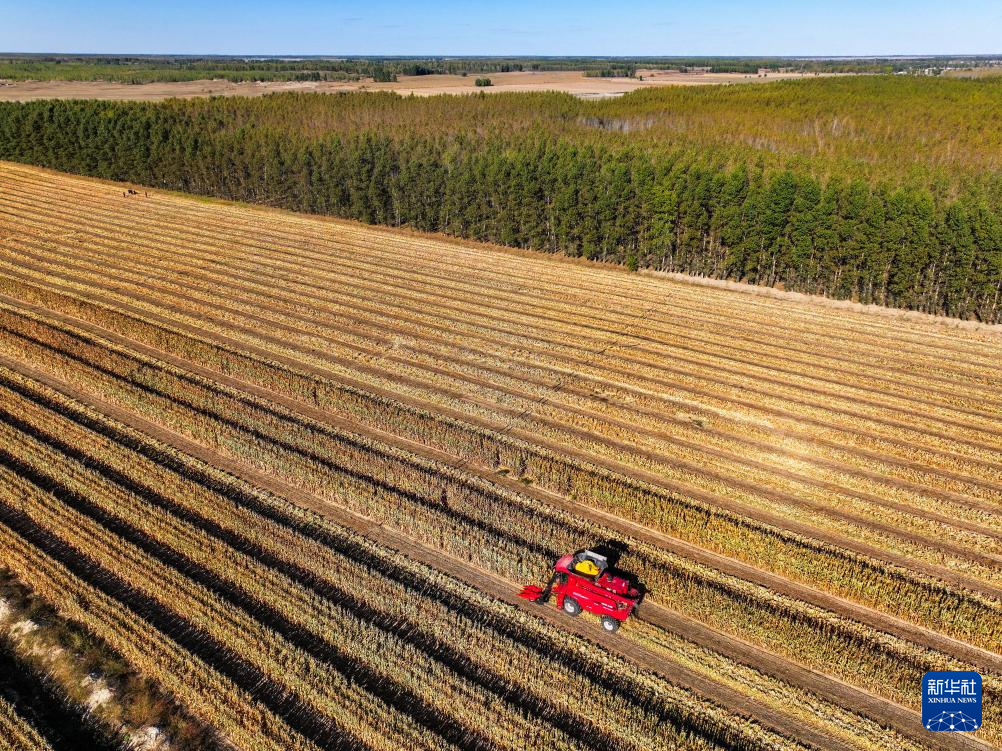10月18日,在通辽市科尔沁左翼后旗吉尔嘎朗镇,农机手驾驶收割机收割玉米(无人机照片)。