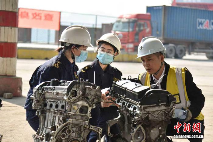 图为梧州海关关员对进口的待再制造汽车发动机进行查验。陈盛 摄