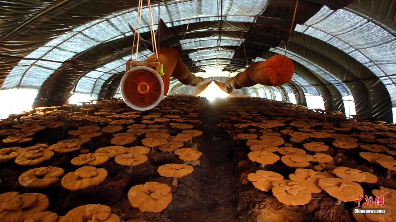 灵芝大棚里风机正在吸收孢子粉。磐石市委宣传部供图