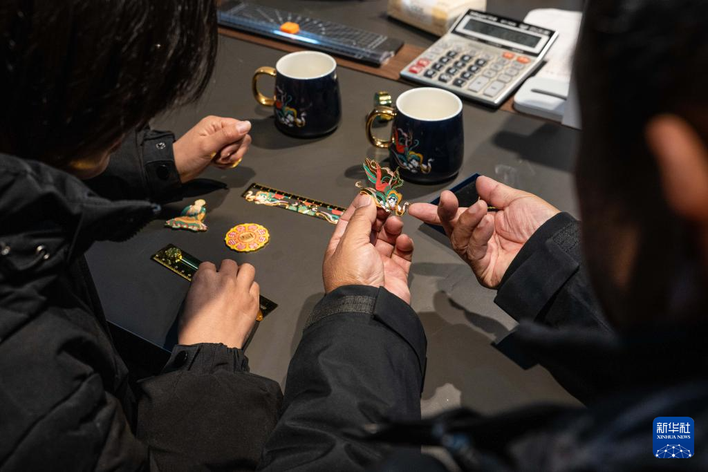 1月15日,杨志坚(左)与同事讨论白沙壁画文创产品设计。