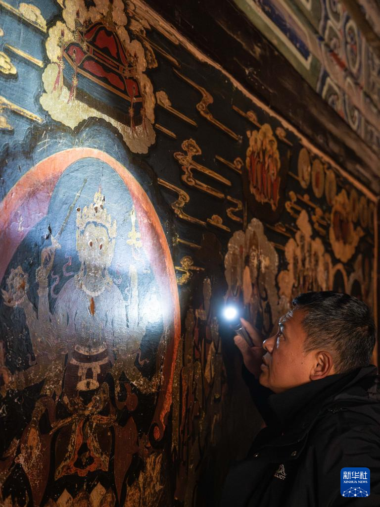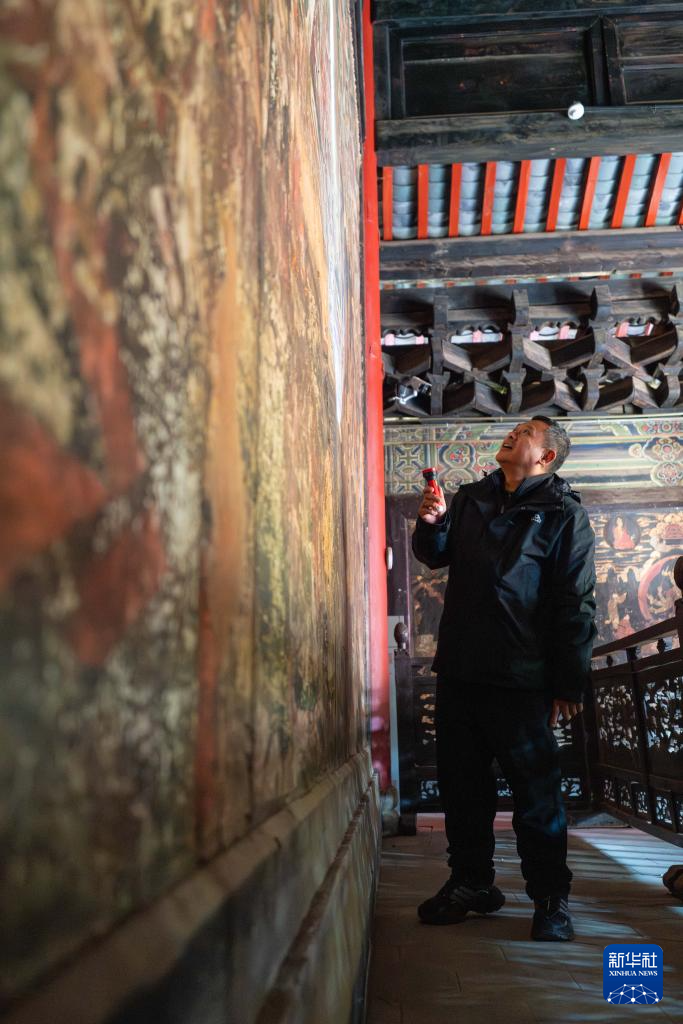 1月16日,杨志坚在白沙壁画博物馆查看壁画情况。