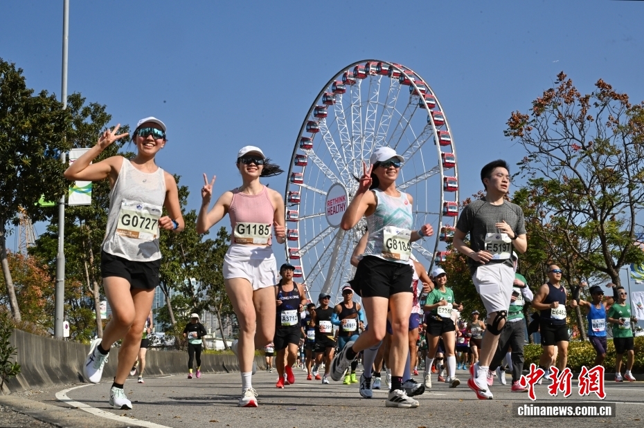 1月18日,2026年渣打香港马拉松开跑,跑者途经金紫荆广场、国际金融中心大厦、香港摩天轮等著名地点,香港美景尽收眼底。图为跑者途经位于中环的香港摩天轮。