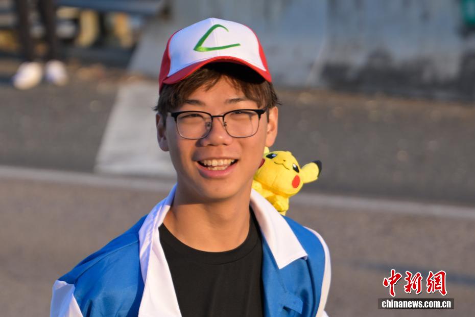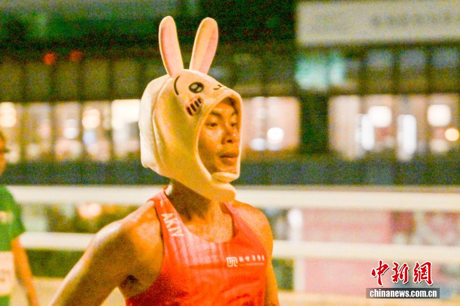图为参赛者戴上卡通人物的帽子参赛。