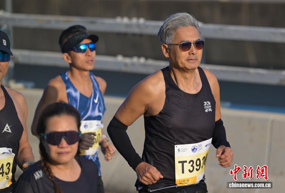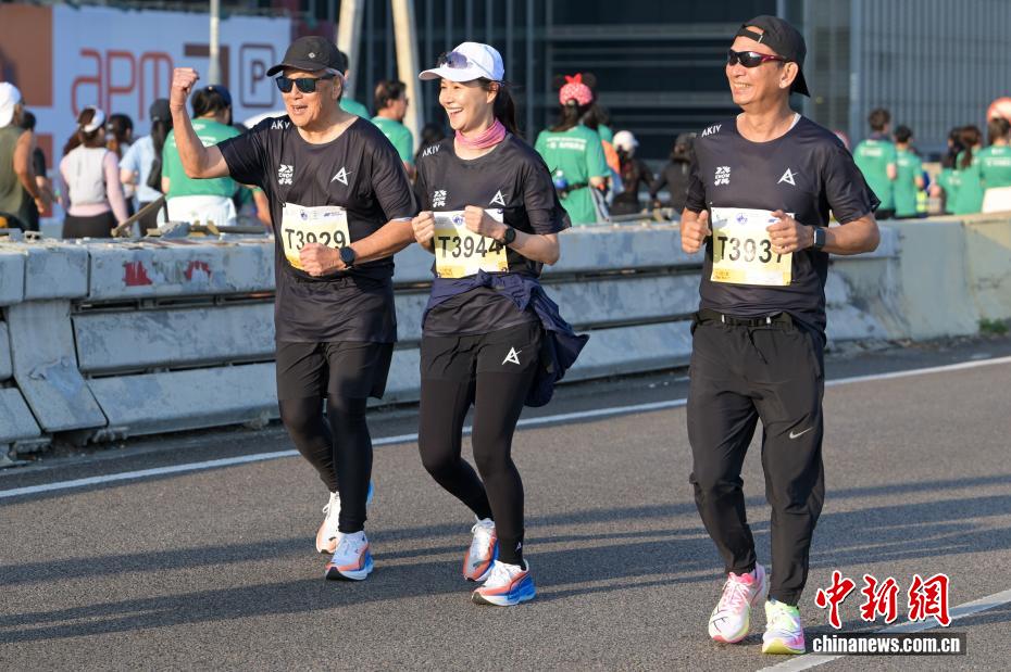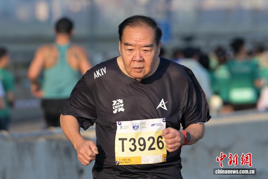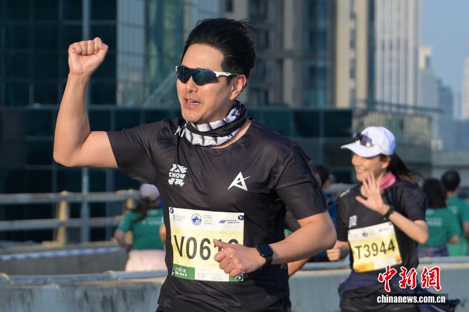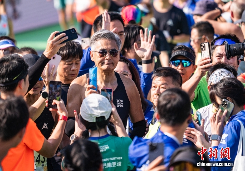 1月18日,2026年渣打香港马拉松开跑,约7.4万名跑者参加全程马拉松、半程马拉松、10公里跑等各组别赛事。图为参加10公里跑赛事的香港演艺明星周润发(中)冲线后受到众人欢迎。