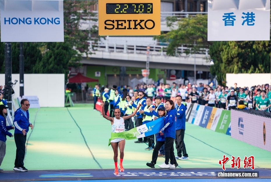 1月18日,2026年渣打香港马拉松开跑,约7.4万名跑者参加全程马拉松、半程马拉松、10公里跑等各组别赛事。巴林选手希塔娅·埃希特·哈布特-贾布里勒(Shitaye Eshete Habtegebrel)以2小時27秒03秒的成绩获得全程马拉松女子组冠军。图为希塔娅·埃希特·哈布特-贾布里勒(中)在终点冲线。