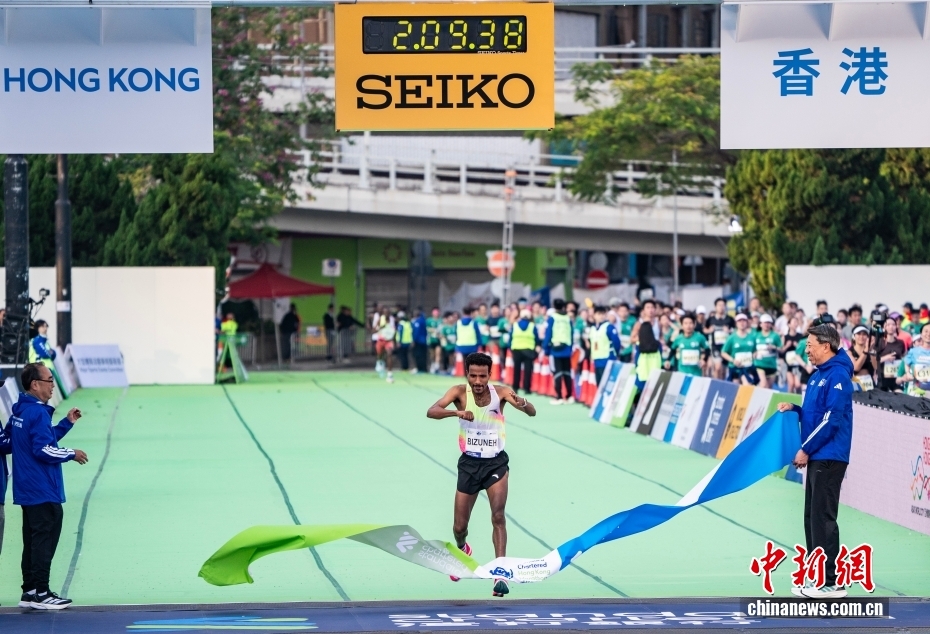 1月18日,2026年渣打香港马拉松开跑,约7.4万名跑者参加全程马拉松、半程马拉松、10公里跑等各组别赛事。埃塞俄比亚选手比祖内赫·贝拉丘(Bizuneh Melaku Belachew)以2小时09分39秒的成绩获得全程马拉松男子组冠军。图为比祖内赫·贝拉丘(中)在终点冲线。