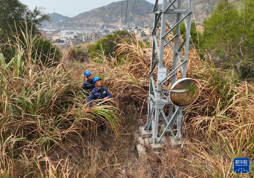 1月26日,刘江平(前)和同事蒋立云在霞浦县海岛乡北澳村进行线路巡查(无人机照片)。