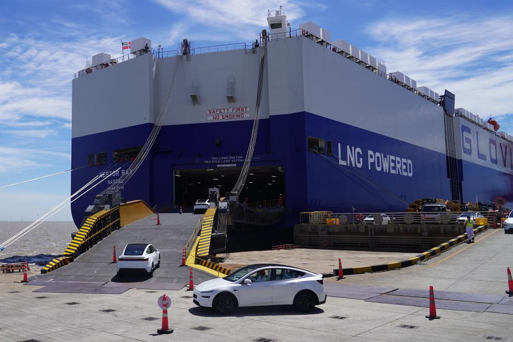 在上海自贸试验区临港新片区南港码头,一批新能源汽车驶向一艘滚装货轮(2025年7月2日摄)。新华社记者 杨有宗 摄