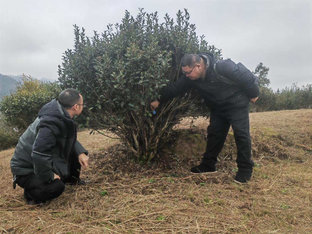 坪山仡佬族侗族乡干部在茶园查看古茶树挂牌情况。新华社记者汪军 摄