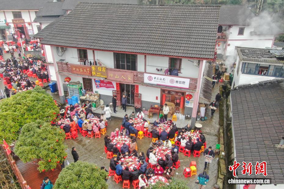 2016年至2026年,是江西省井冈山市神山村振兴蝶变的十年。这座坐落于革命老区大山深处的村庄,曾是典型的“偏”“远”“穷”小山村,发展步履维艰。十年间,神山村实现美丽蜕变,路通景美、产业兴旺,外出村民纷纷返乡创业,四方游客慕名而至,2025年神山村村集体经济经营性收入突破百万元人民币。如今的神山村成为了全国乡村旅游重点村,更被列为首批“全国脱贫攻坚考察点”,走出了一条红绿融合、产业富民的乡村振兴之路。图为2026年2月1日,航拍神山村“神山宴”现场,村民和外来游客共聚一堂,大家品竹笼稻香蒸大鹅、粉蒸清泉鱼、地道宁冈酥肉等井冈山特色美食,感受神山村的浓浓年味。(无人机照片)