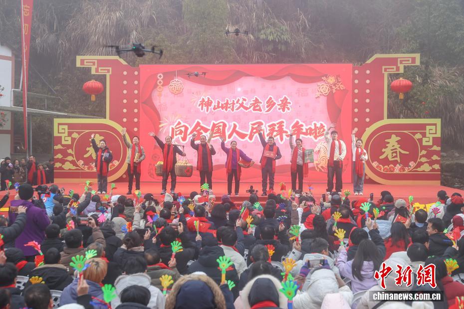 2016年至2026年,是江西省井冈山市神山村振兴蝶变的十年。这座坐落于革命老区大山深处的村庄,曾是典型的“偏”“远”“穷”小山村,发展步履维艰。十年间,神山村实现美丽蜕变,路通景美、产业兴旺,外出村民纷纷返乡创业,四方游客慕名而至,2025年神山村村集体经济经营性收入突破百万元人民币。如今的神山村成为了全国乡村旅游重点村,更被列为首批“全国脱贫攻坚考察点”,走出了一条红绿融合、产业富民的乡村振兴之路。图为2026年2月1日,第十届神山村百姓“村”晚上演,在村民走秀《晒丰收、晒喜悦》节目中,神山村村民代表们集体登台亮相,他们中有井冈红神山茶“代言人”彭德良(图右四)、“全国三八红旗手”“全国脱贫攻坚先进个人”获得者彭夏英(图中)等神山村乡村振兴带头人,还有返乡创业青年和神山村走出去的大学生代表。