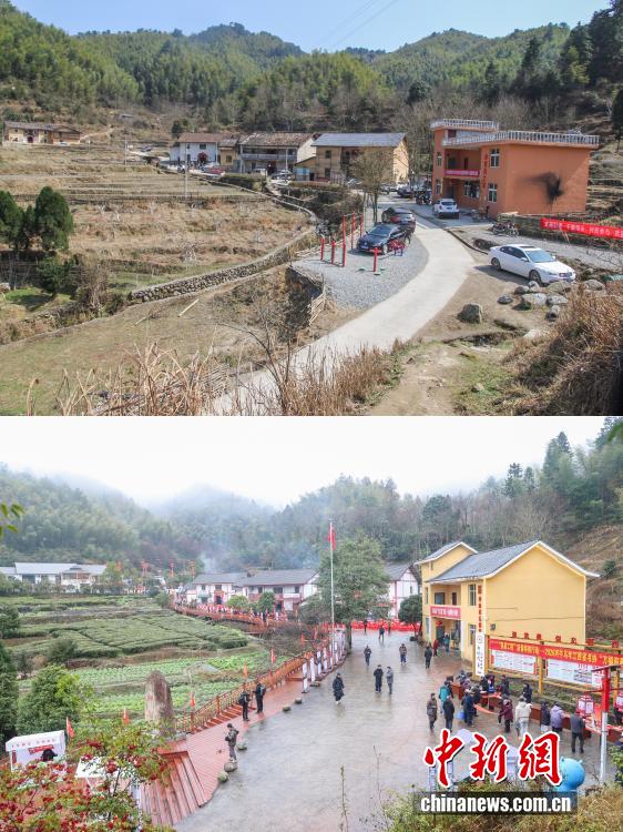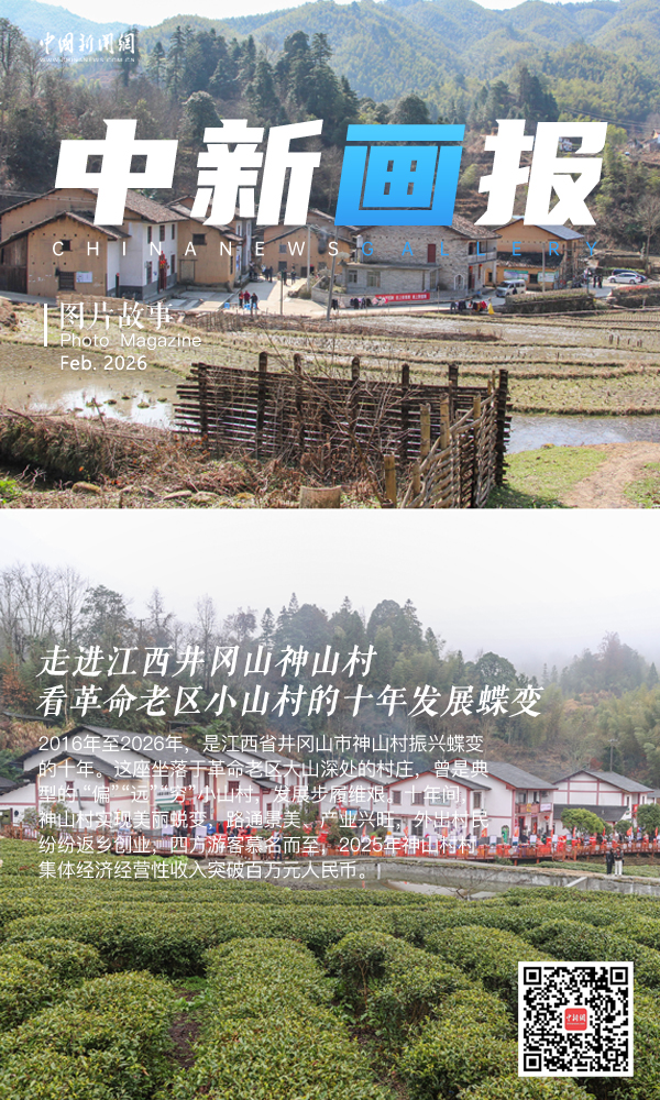 2016年至2026年,是江西省井冈山市神山村振兴蝶变的十年。这座坐落于革命老区大山深处的村庄,曾是典型的“偏”“远”“穷”小山村,发展步履维艰。十年间,神山村实现美丽蜕变,路通景美、产业兴旺,外出村民纷纷返乡创业,四方游客慕名而至,2025年神山村村集体经济经营性收入突破百万元人民币。如今的神山村成为了全国乡村旅游重点村,更被列为首批“全国脱贫攻坚考察点”,走出了一条红绿融合、产业富民的乡村振兴之路。上图为2016年2月17日,大山脚下的神山村,村里大都是土坯房(井冈山市委宣传部供图),下图为2026年2月1日,神山村新貌,白墙黛瓦的客家民居错落有致分布,村前种上了茶叶。(拼版图)