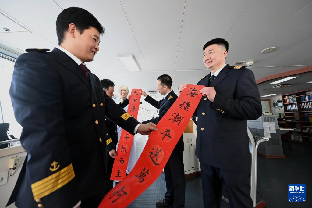 2月4日,天津港引航中心引航员孙勃(右)在“中远海法”轮上向船长赠送春联。