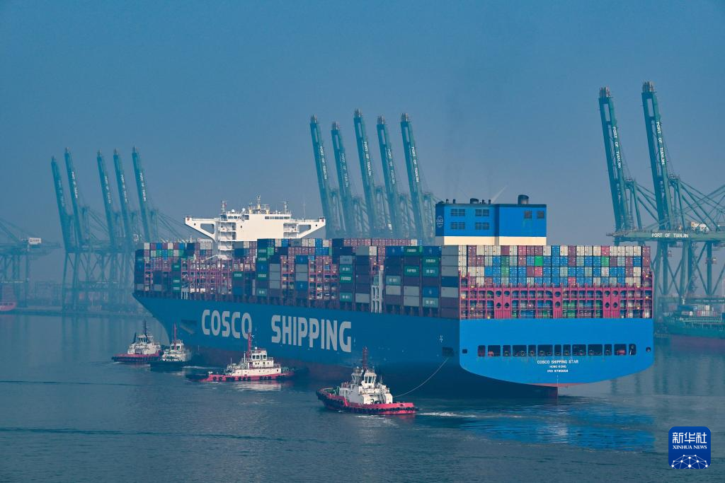 2月4日,一艘集装箱货轮准备靠泊在天津港集装箱码头。
