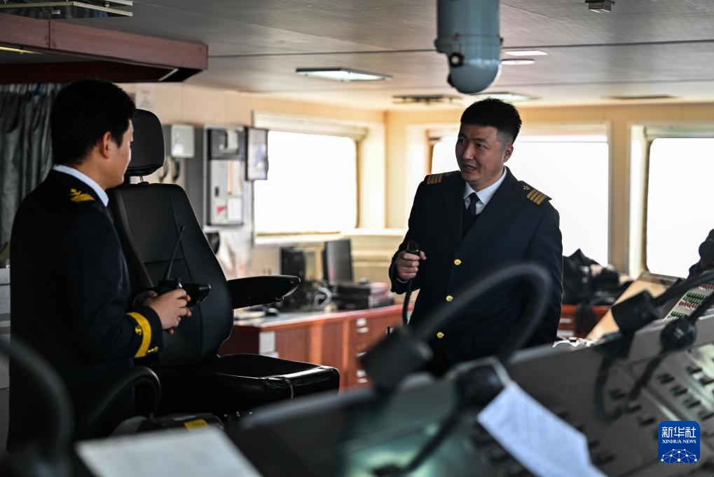 2月4日,天津港引航中心引航员孙勃(右)在“中远海法”轮驾驶室和船长沟通。