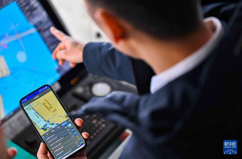 2月4日,天津港引航中心引航员许钦平在“中远海法”轮上通过手机查看船舶动态。