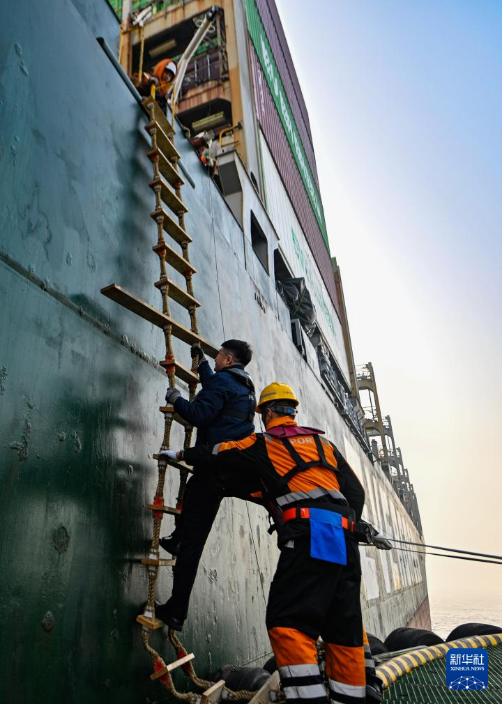 2月4日,在天津港锚地,天津港引航中心引航员孙勃攀爬软梯,他将在登船后引航该船入港。