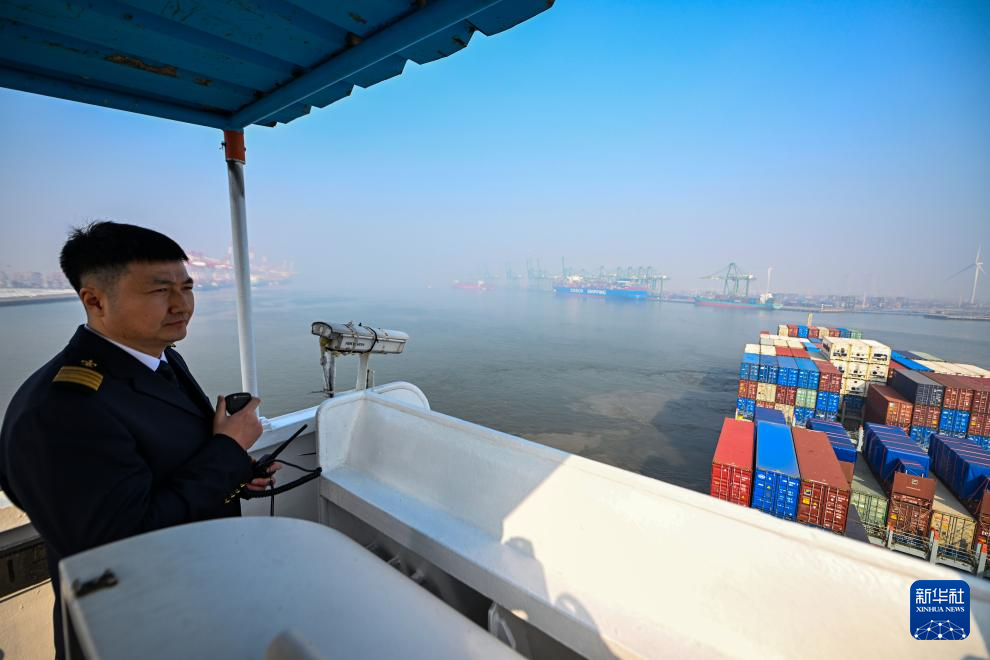 2月4日,天津港引航中心引航员孙勃在“中远海法”轮上指挥货轮进行离泊作业。