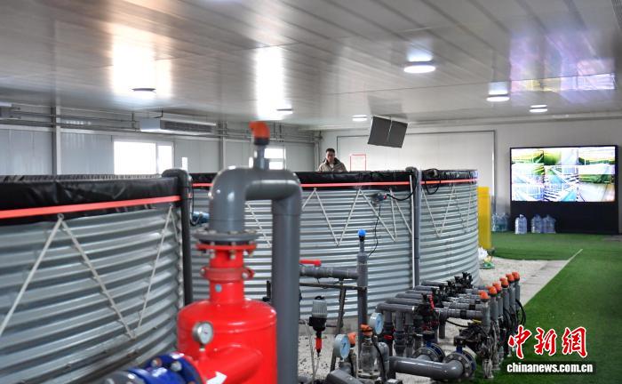 2月11日,雄安一农业园的智能玻璃温室内,工作人员正在水培控制室巡检。中新社记者 韩冰 摄