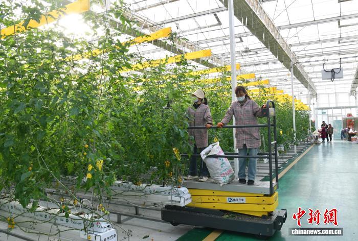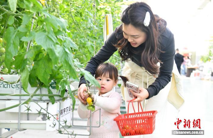2月11日,雄安一农业园的智能玻璃温室内,游客正在采摘西红柿。中新社记者 韩冰 摄