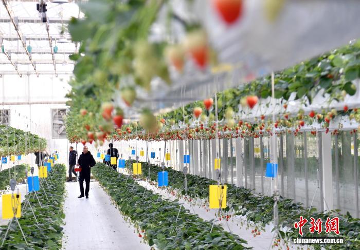 2月11日,雄安一农业园的智能玻璃温室内,游客正在采摘草莓。中新社记者 韩冰 摄