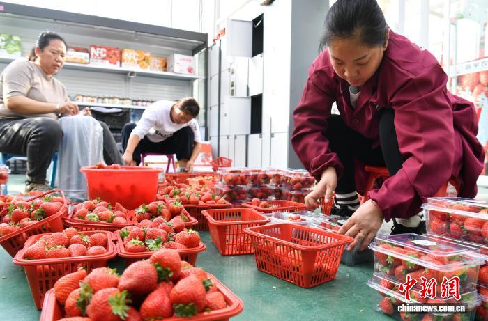 2月11日,雄安一农业园的智能玻璃温室内,工作人员正在打包采摘下来的草莓。中新社记者 韩冰 摄