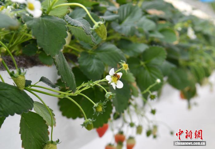 2月11日,雄安一农业园的智能玻璃温室内,蜜蜂正在为草莓授粉。中新社记者 韩冰 摄