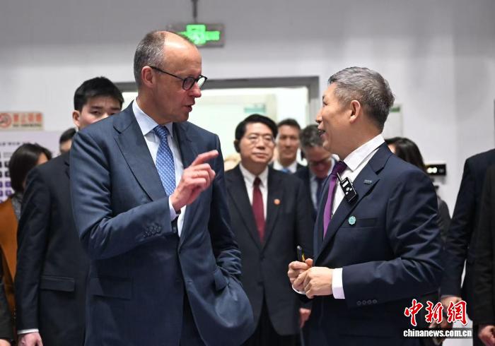 2月26日,德国总理默茨与西门子能源全球高级副总裁、大中华区负责人姚振国交谈。王刚 摄