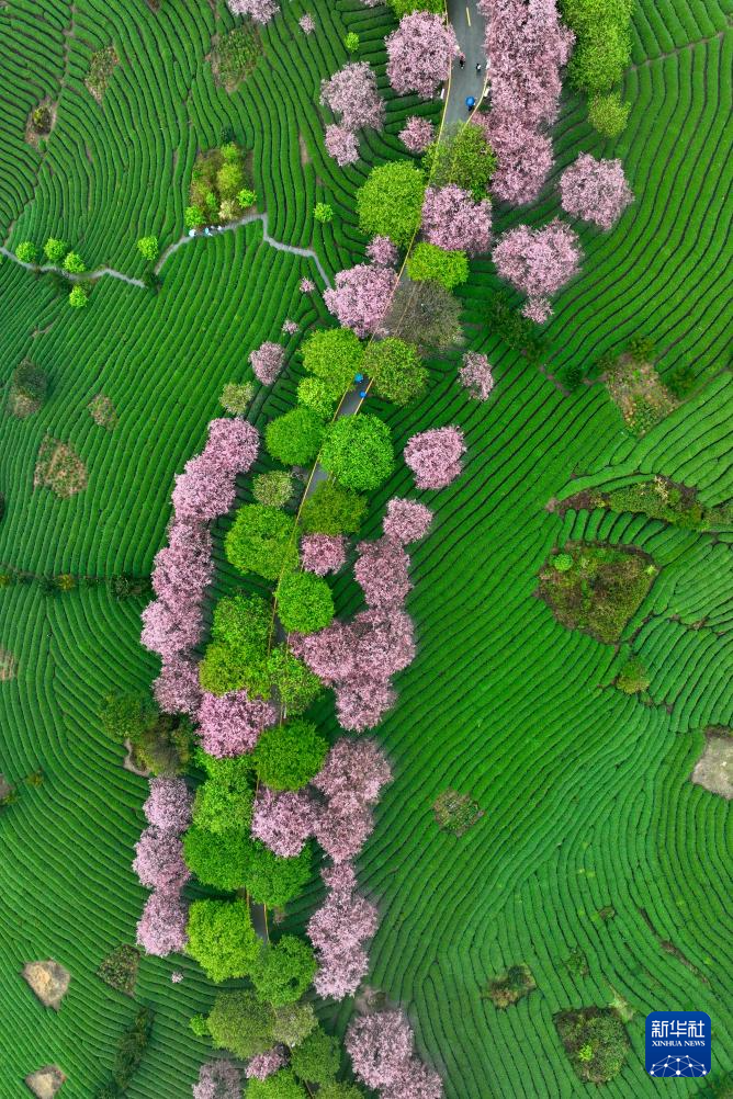 这是2月28日拍摄的福建省漳平市永福镇台品樱花茶园美景(无人机照片)。