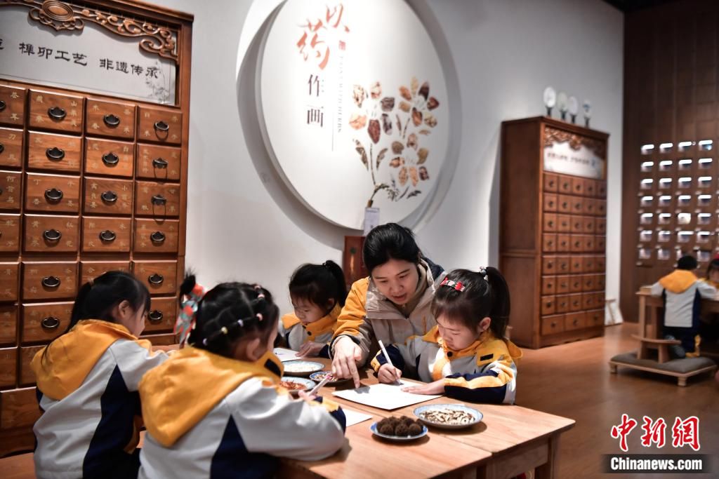 在河北安国中医药文化博物馆,小朋友体验“以药作画”。中新网记者 翟羽佳 摄