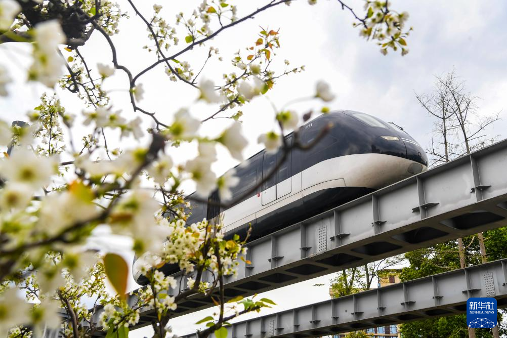 3月18日,云巴穿梭在重庆市璧山区的花带中。